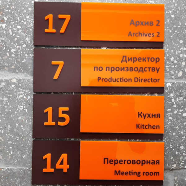 Призначені інформувати потенційних клієнтів про місце розташування офісу. Їх встановлюють у торгових центрах, готелях, офісних будинках, торгових центрах. Виконані в одному загальному стилі, що гармонує з дизайном усередині приміщення. Можна виготовити зі змінною інформацією, наприклад, ім’ям та прізвищем співробітника, посаду або вказують особливості пересування по офісу.